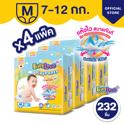 [โฉมใหม่ ขายยกลัง] BabyLove Playpants เบบี้เลิฟกางเกงผ้าอ้อมเพลย์แพ้นท์ ไซส์ M 4 แพ็ค 232 ชิ้น (แพ็คละ 58 ชิ้น)