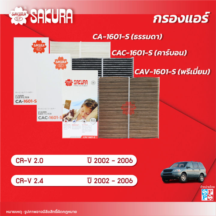 กรองแอร์ซากุระ ฮอนด้า ซีอาร์วี เครื่องยนต์ 2.0/2.4 ปี 2002-2006 รหัสสินค้า CA-1601-S/CAC-1601-S/CAV-1601-S